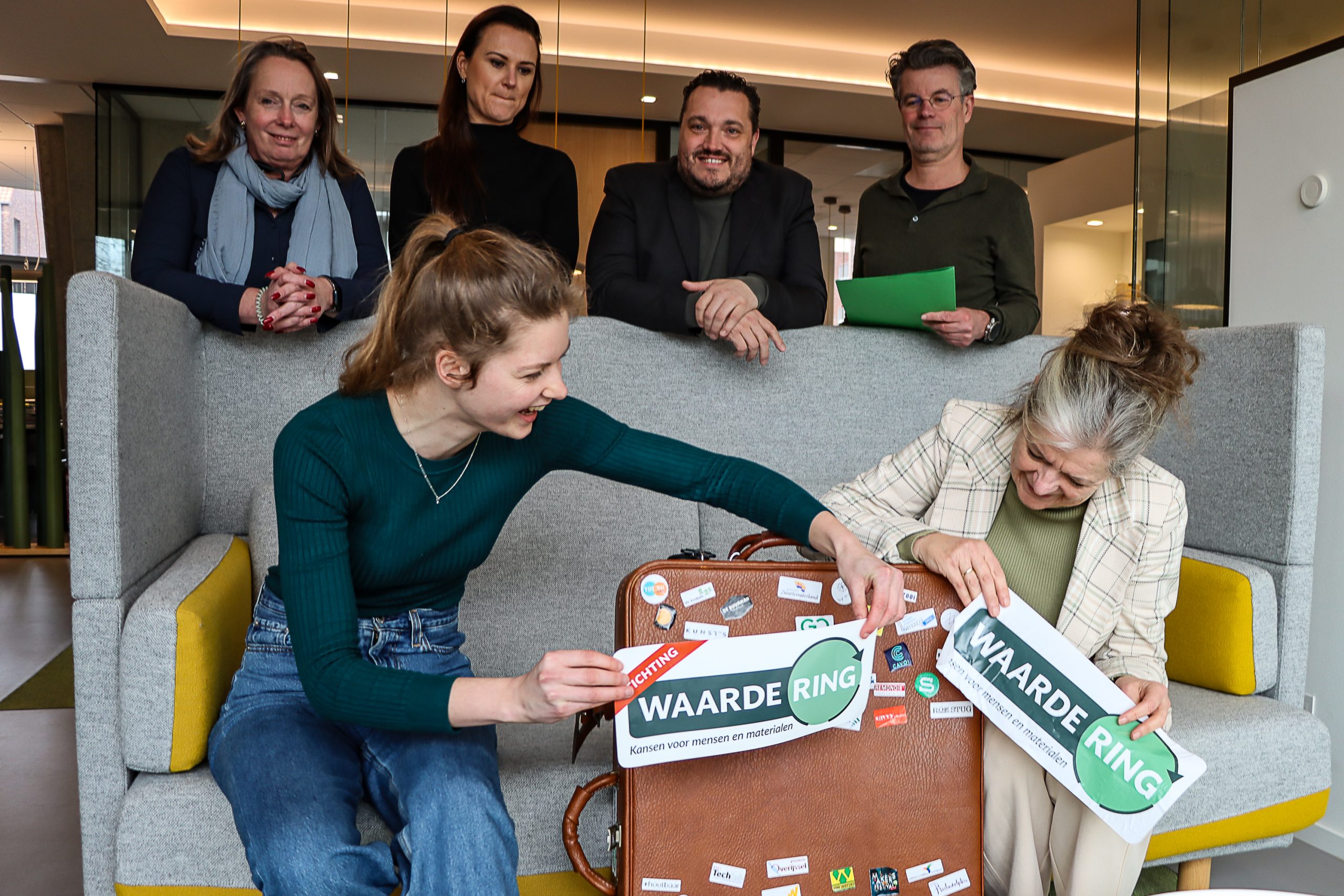 Een feestelijke mijlpaal voor de circulaire regio Zwolle! Stichting WaardeRing is een feit. Op woensdag 18 februari ondertekenden de vier nieuwe bestuursleden de Notariële Akte van Oprichting bij de notaris. De sticker op de reiskoffer van WaardeRing, met daarin een R-ladder met circulaire WaardeRing-voorbeelden, werd vervangen door ‘Stichting WaardeRing’. Een klein gebaar met een grote symboliek: circulariteit en inclusiviteit krijgt in de regio een stevige basis.