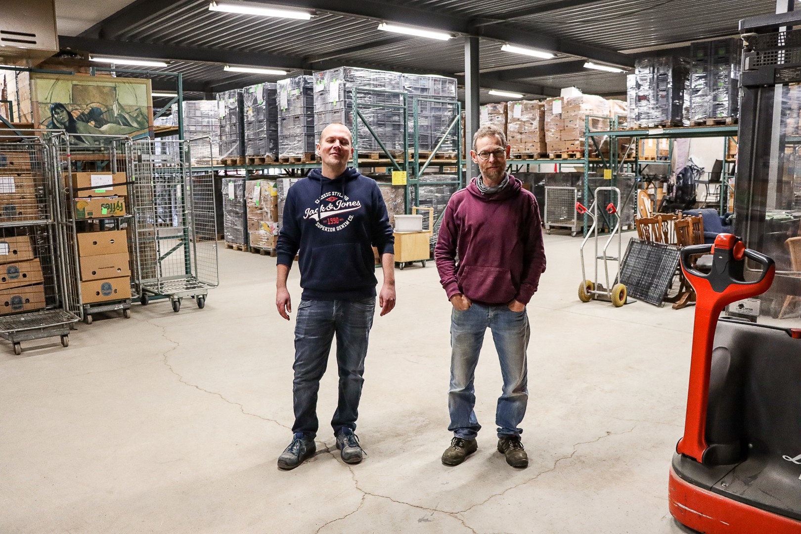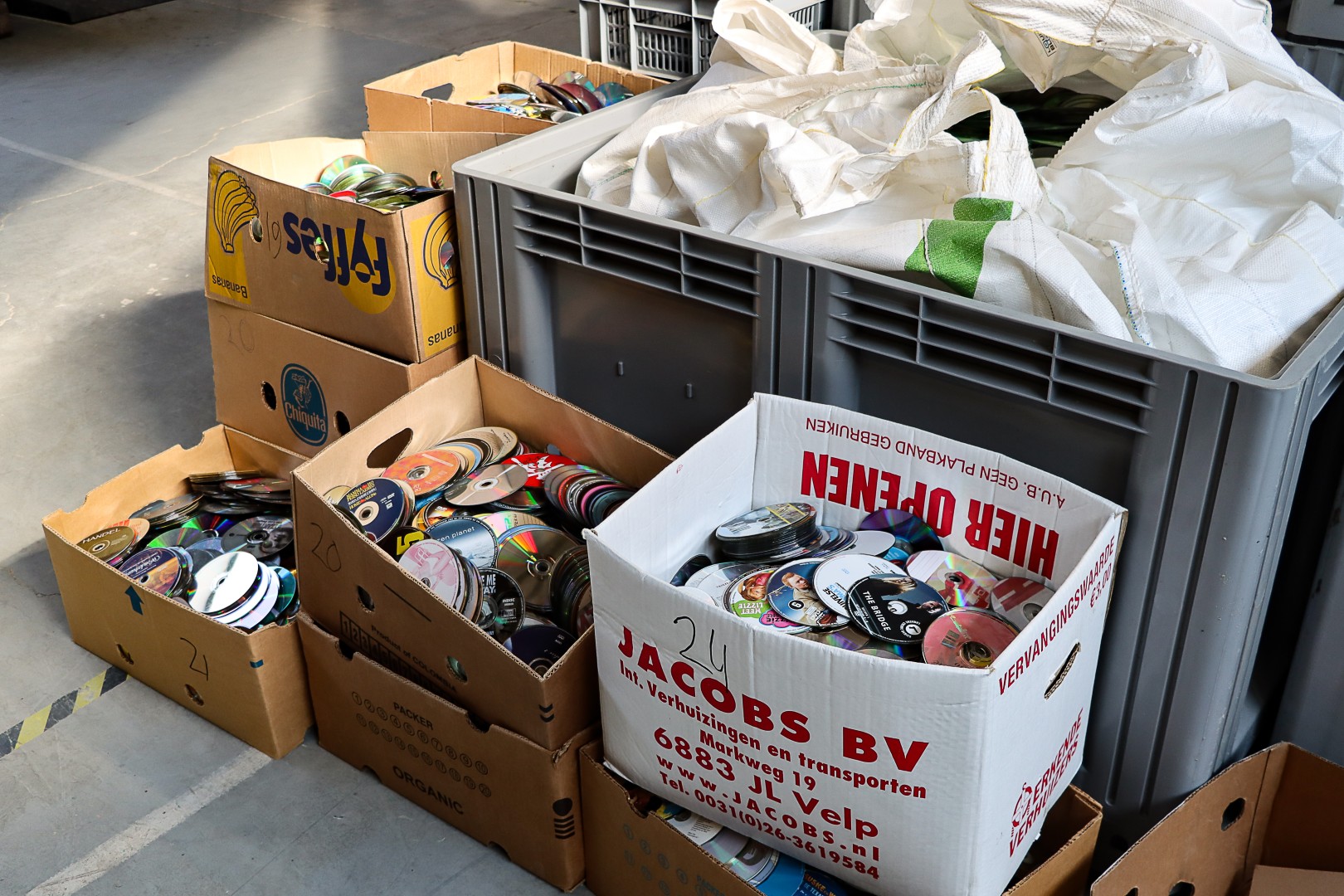 In de opslag in Staphorst staan inmiddels dertien grote bakken vol lp’s. Samen goed voor zo’n 3.300 kilo vinyl. De platen zijn afkomstig uit de inzameling bij de vestigingen van Stichting Kringloop Zwolle/Noggus&Noggus. Verkoopbare exemplaren worden eruit gevist; de rest gaat de circulaire WaardeRing-keten in. Of beter gezegd: ging die keten in. ‘De lp’s worden uit de hoezen gehaald door leerlingen en dagbestedingslocaties zoals Frion en arbeidstrainingscentrum TIB,’ vertelt Jarno Compagner, hoofd magazijn en werkbegeleider bij Noggus&Noggus in Staphorst. ‘Het papier gaat naar papierrecycling, de platen zelf werden afgevoerd naar een gespecialiseerde recycler. Dat werkte een tijd lang goed.’ Tot anderhalf jaar geleden afnemer VinylRecycling in Lelystad failliet ging. Sindsdien stapelen de lp’s zich op. Als lp verkopen kan niet meer zonder hoes. Recyclen lukt evenmin. De partij is verweesd geraakt.